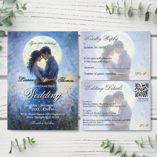 Feiern Sie Ihre Liebe unter den Sternen mit dieser bezaubernden Mondlichthochzeit. Mit einer romantischen Aquarellillustrierung eines unter einem glühenden Vollmond umarmten Paares Set dieses himmlische Design den Ton für eine magische und unvergessliche Feier. Ideal für Hochzeiten im Abend, schicke Boho-Zeremonien oder Paare, die eine Einladung gewollt haben, die ihre Liebe erzählt. Personalisieren Sie Ihre Namen, Daten und Veranstaltungsdetails, um einen einzigartigen Sake für Ihren besonderen Tag zu schaffen.