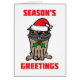 Niedlicher Cartoon Mops in einer Weihnachtsmannmütze und Holly Weihnachtskarte. Die Hintergrundfarbe der Karte ist anpassbar.