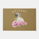 Watercolormalerei eines Mopswelpen, der mitten in rosa Pfingstrosen-Blumen sitzt. Der oben genannte Text sagt "Willkommen," und Ihren Familiennamen kann an der Unterseite gedruckt werden. Großer Entwurf für Hundeliebhaber.