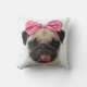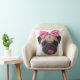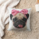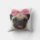 Mops Hund mit Zunge aus, mit einem rosa Band, weißem Hintergrund.