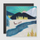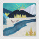 Eine digitale Landschaft mit hellen Farben und Texturen, die einen Musher mit einem Hundeschlittenteam zeigt, und einem leuchtend rosa Sonnenaufgang in den Farbtönen Blau, Gold, Cyan und Gelb.