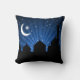 Islamische Illustration mit Silhouetten des Mondes, Sternen und einer Moschee am blauen Nachthimmel.