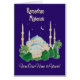 Eine stilvolle Ramadan-Grußkarte "Von unserer Zuhause zu Ihrer" mit einer Moonlicht-Moschee auf tiefblauem Hintergrund, und "Ramadhan Mubarak", ein Aquarellbild von Judy Adamson.
