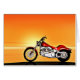 Ein Motorrad, ähnlich wie ein Harley, das am Meer stehend ist und einen herrlichen orangefarbenen Sonnenuntergang bietet. Ein tolles Geschenk für alle, die Fahrrad und Motorrad mögen. Erleben Sie das ganze Kartenangebot für Beziehungen und Jahrgänge in meinem Geschäft. Alle Kunstwerke, Copyright Norma Cornes