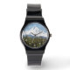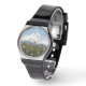 Stilvolle Armbanduhr mit weißen Ziffern, die ein landschaftliches Foto von schneebedeckten Berg Hood über Obstgärten im Tal zeigt. Wählen Sie Ihre Uhr aus verschiedenen Stilen.