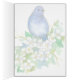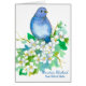 Eine leere Notizkarte, die mit einem Bluebird aus dem Gebirge auf einer Syringa dekoriert ist, ein Orangenmock, ein mit Aquarell bemalter Blumenstrauß. Das Design wird von der Staat Vogel und Staat Blume für Idaho inspiriert.