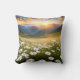 Weiße, sonnige Wiese mit Bergkulisse bei Sonnenaufgang.