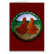 Ein roter und gelber Muffed Tumbler grace diese gemalte Platte, mit einem grünen Wald hinter ihnen und Gitter arbeiten um sie herum. Diese Vögel sind eine beliebte Ausstellung extravagante Tauben.