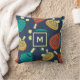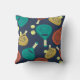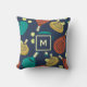 Dieses Kissen ist fertig, um nach Ihren Vorstellungen angepasst zu werden und bietet ein Muster von Pdel-Tennisschläger und Kugeln in den Tönen Terra Cotta, Gold, aquamarin, Gelb und Creme vor einem marineblauen Hintergrund.