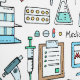 Dieses Design zeigt verschiedene Objekte, aus denen sich ein Muster zusammensetzt, das sich auf das medizinische Feld bezieht.