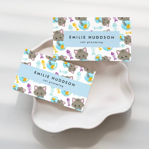 Niedliche, lustige und bezaubernde Visitenkarten mit Katzen, Fischschalen und Fischen. Modernes und trendiges Design, ideal für Tierhandlungen, Katzenmädchen, Katzengroßhändler und Katzenzüchter.