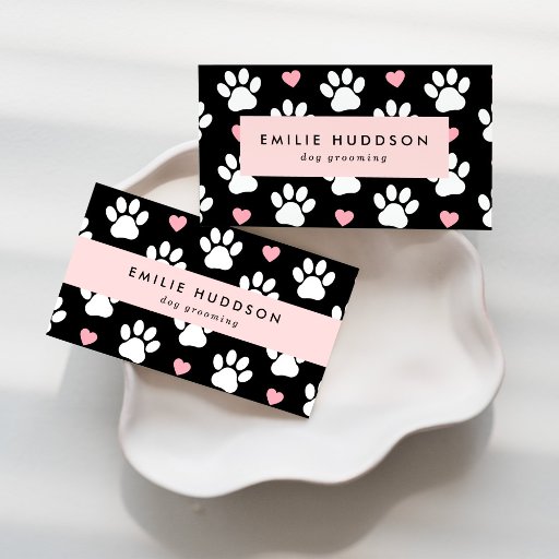 Niedliche, lustige und bezaubernde Visitenkarten mit weißen Pfoten und rosa Herzen. Modernes Design, perfekt für Hundetrainer, Hundegroßhändler, Hundeschuhler, Haustierer, Tierhändler und Tierärzte.
