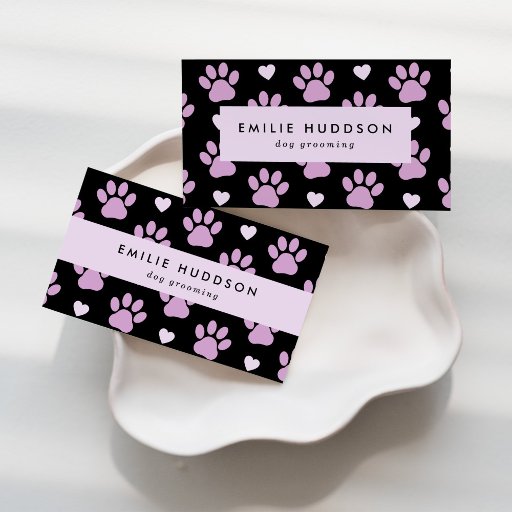 Niedliche, lustige und bezaubernde Visitenkarten mit lila Pfoten und lila Herzen. Modernes Design, perfekt für Hundetrainer, Hundegroßhändler, Hundeschuhler, Haustierer, Tierhändler und Tierärzte.