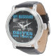 This proud wall clock celebrates the formidable profession of a truck driver, from a loving partner's perspective. Against a black background with a blue rim, it features a bold blue semi-truck illustration and the straightforward declaration: "MY HUSBAND DRIVES A BIG TRUCK". It's an ideal gift for anyone who wants to show pride in their husband's demanding but essential career. The design tool can also be used to add custom text if you want your name or company on this clock. You can customize the color of the frame to any color you desire by going into the design tool.
