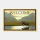 Irgendwo im Inneren von Alaska schleicht ein Elch an einem sonnigen Herbstnachmittag durch einen Teich, zusammen mit dem Text "WILLKOMMEN". Mit dem Ende des Jahres nähert sich das Licht dem typischen gelblichen Ton, der alles ein wenig brüchig erscheinen lässt. Die Sonne fällt zwischen den Bergen im Hintergrund ab.