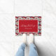 Eleganter Happy Holidays Doormat mit einem weißen Skript auf einem roten Hintergrund, der durch eine Grenze zum Weihnachtsmann verziert ist. Personalisieren Sie Ihre Daten mit Ihrem Familiennamen oder Text.