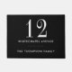 Elegante personalisierte schwarz-weiße Türmatte mit Hausnummer, Adresse und Familienname Set in schicker Typografie. Entwickelt von Thisisnotme©