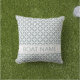 Juniper Green und White geometrische Muster Design Akzent Kissen für Außensitzflächen, Patio und Deck. Pastel Green Boat Name Kissen mit japanischem SHIPPO-Muster und moderne minimale Typografie. Die elegante Dekoration verkörpert Power, Konzentration und das Zusammenspiel verschiedener Elemente. Eine mächtige Deck-Dekorations-Idee und eine schöne Geschenkidee für Bootsfahrer und Segler. #ybeedesign #ybeesea #boatnamepillow #nauticalpillow Patio deck dekorative Ideen aus ozeanischer Liebe © Design y.BEE SEA
