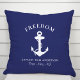 Ein modernes nautisch-thematisches Kissen für Ihr Boot, das eine weiße Abbildung eines Ankeres auf einem dunkelmarineblau blauen Hintergrund zeigt. Sie können mit dem Namen Ihres Bootes, einer Textzeile für den Namen des Kapitäns oder der Familie oder etwas Ähnliches und einem Ort personalisieren.