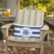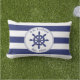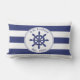 Dieses Kissen mit dem Namen Ihres Bootes und dem Jahr der Einrichtung ist für Sie persönlich. Das Design ist mit einem marineblauen Kapitän-Rad mit einem kreisrunden Seilstreifen versehen. Der Hintergrund ist blau-weiße Streifen. Die Rückseite des Kissens ist marineblau.
