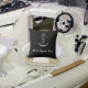 Ein klassischer schwarzer Hintergrund. Dekoriert mit Imitaten silberner Anker. Personalisieren Sie den Namen des Bootes und fügen Sie ihn hinzu.