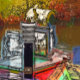 Ein Kunstdesign eines Schmalschiffkamins und einer alten, dekorierten Lampe.Die in Großbritannien als Schmalboote bekannten Canal Boote wurden ursprünglich für den Transport von Waren im ganzen Land verwendet. Sie werden heute hauptsächlich zur Freizeitgestaltung genutzt und ziehen Menschen aus aller Welt an, um unsere ländliche Umgebung zu genießen. Diese Boote sehen sehr hübsch mit ihren hellen Kabinen aus, die traditionell blau, rot oder grün sind. Blume und Schlossdesigns schmücken auch die traditionelleren Boote.