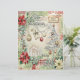 The design features a vibrant patchwork border of distressed red and sage green patterns, including damasks and plaids, framing a soft, snowy center. The center is richly decorated with classic holiday elements: bold red and cream poinsettias, snow-dusted foliage, and festive ornaments.