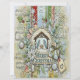 The design features a vintage-inspired background of distressed paper, sheet music, and rustic stamps, giving it an authentic aged feel. The centerpiece is a snowy Nativity scene framed by a gorgeous, elaborate wreath.