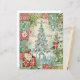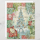The design features a charming patchwork border of rich reds and varied greens with damask, plaid, and scenic patterns. The center showcases a stunning, icy blue Christmas tree, heavily decorated with gold and silver ornaments, set against a background of sheet music. Below the tree, a serene Nativity scene is subtly rendered in blue tones.