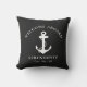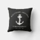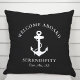 Ein schicker, moderner nautischer Kissen für Ihr Boot, der eine weiße Abbildung eines Ankeres auf schwarzem Hintergrund zeigt. Sie können den Text "Welcome Abard" und den Namen und die Lage Ihres Bootes in der modernen weißen Typografie personalisieren.