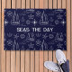 Nautical Navy Blue Sailboat Pattern Door Mat. Customize with your boat name or your name! Classic nautical design to elevate the decor in your vessel or your home.