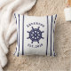 Kissen mit Familienname und dem schönsten Jahr, um das Kissen für die Zuhause-Dekoration im Küstenstil leichter zu gestalten. Wählen Sie "Personalize this template", um den Familiennamen end est. year zu schreiben. Dieses Kissen ist mit dunkelmarineblau-weißen Streifen verschiedener Stärke auf beiden Seiten dekoriert, sodass man die Dekoration eines Strandhauses abwechseln kann, indem man dieses nautische Kissen dreht. Das Rad des Schiffes schmückt eine Seite des Kissens.