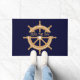 Nautical Navy Blue Wheel Custom Name Floor Mat. Customize with your boat name or your name! Classic Navy and Gold Tan nautical design to elevate the decor in your vessel or your home.