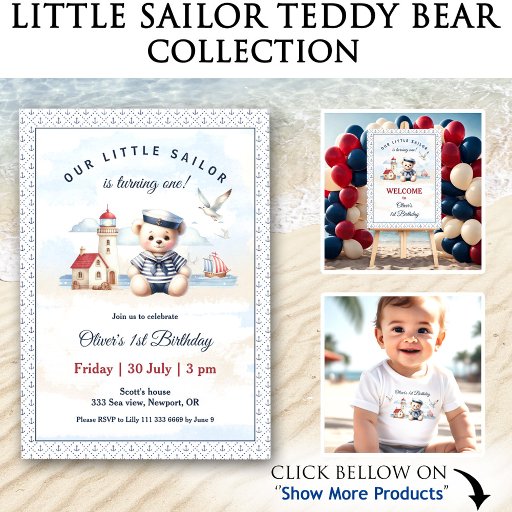 Niedlichen kleine Seemannsbeutel mit einem zauberhaften Teddybär in einem Segelschiff, Boot, Seagull und Leuchtturm für den 1. oder einen beliebigen Geburtstag eines kleinen Jungen. Navy Wasserfarbe Ankermuster Rahmen. Personalisieren Sie den Text einfach. Kate Eden Art