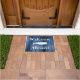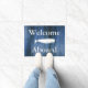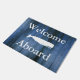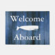 Nautical Doormat Sprichwort "Willkommen an Bord" in weißem Text mit blauen Holzplanken und einer nautischen Wal-Silhouette in Weiß.