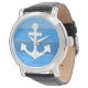 Nautisches Design mit Ankerdekoration auf blau gestreiftem und grauem Holzboden. Bitte beachten Sie, dass dies nicht aus Holz ist, es ist eine Holzgrafik.