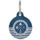 Nautisches Design mit nautischen Symbolen (Anker, Segelboot, Segelrad, Kompass) Dekoration auf weißem und marineblauen Streifen Hintergrund.