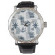 Seamless thematied design mit Segelboot, Kompass, Anker- und Segelraddekoration auf blau-weißem geometrischem Hintergrund