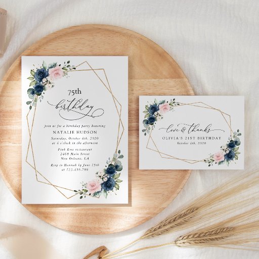 Add a personal touch to your birthday celebration with these stylish and memorable party items! Design features navy and blush pink watercolor flowers, greenery and gold frame on white background.