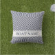 Navy Blue Herringbone-Muster Patio Deck Dekor Idee. Dekoratives Kissen im Freien mit elegantem geometrischem Herringbone-Muster in Navy Blau und Weiß mit Boat Name Vorlage. Dieses nautische Kissen ist eine kluge Geschenkidee für sie und ihn, für Bootsfahrer und Segler, und eine schöne Dekorationsidee für alle Außensitzplätze. #ybeedesign #ybeesea #herringbonepattern © Design y.BEE SEA