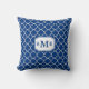 Dieses Kissen ist mit einem marineblau-weiß-vierblättrigen Muster-Hintergrund versehen, in dessen Mitte Ihr dreiteiliges Monogramm steht. Das Monogramm wird auf einem extravaganten weißen Banner platziert, das doppelt in passendem Blau ausgekleidet ist. Die Rückseite des Kissens hat das gleiche Vierblattmuster, aber ohne Banner und Monogramm, was Ihnen ein schönes, umkehrbares Kissen verleiht. Ein zeitloser Klassiker! Sehen Sie sich die passenden Betten- und Badezubehör in unserem Shop an.
