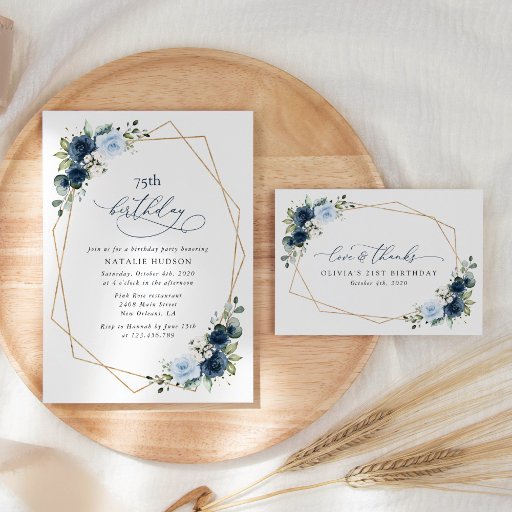 Add a personal touch to your birthday celebration with these stylish and memorable party items! Design features navy and blue watercolor flowers, greenery and gold frame on white background.