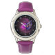 Nebula Uhrendesign auf einem lila Uhrenriemen. Die Uhr hat ein Fantasieraumdesign mit einer leidenschaftlichen Blume, umgeben von Raumgläsern und Sternen. Die Nummern können entfernt werden, es ist Ihre Wahl.