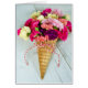 buntes Nelkenbukett in Waffelkonus mit Streichbogen auf rustikal weiß gekalktem Holz zum Geburtstag