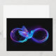 Glühendes, lila Unendlichkeitssymbol mit fliegendem, leuchtendem, blauen Kolibri auf schwarzem Hintergrund. Neon.