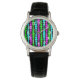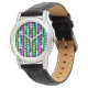 Diese Uhr hat ein modernes Design von neonrosa, grün und blau abgerundeten Rechtecken in steigender und abnehmender Größe, die vertikal auf einem Feld aus schwarz läuft.