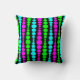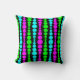 Dieses Kissen hat ein modernes Design von neonrosa, grün und blau abgerundeten Rechtecken in steigender und abnehmender Größe, die vertikal auf einem Feld aus schwarz läuft.