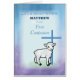 Das Schaf steht vor einem blauen Kreuz auf dieser katholischen Gratulationskarte, wenn man das erste Geständnis eines Jungen feiert.