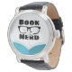 Illustration eines Brillenpaares und eines Buches mit Textlesen: "Nerd buchen"