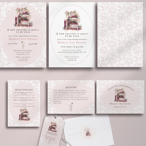 Diese süße Einladung ist für ein Baby-Dusche-Event mit dem Thema "Neues Kapitel". Mit dem Text - "Ein neues Kapitel wird demnächst erzählt". Die Karte zeigt Illustrationen eines Aquarellbildes mit blühenden Büchern und die Rückseite hat ein helles, rosa-blaues Muster. Klassischer deutscher Schriftart für ein Gefühl alter Kinderbilderbücher.